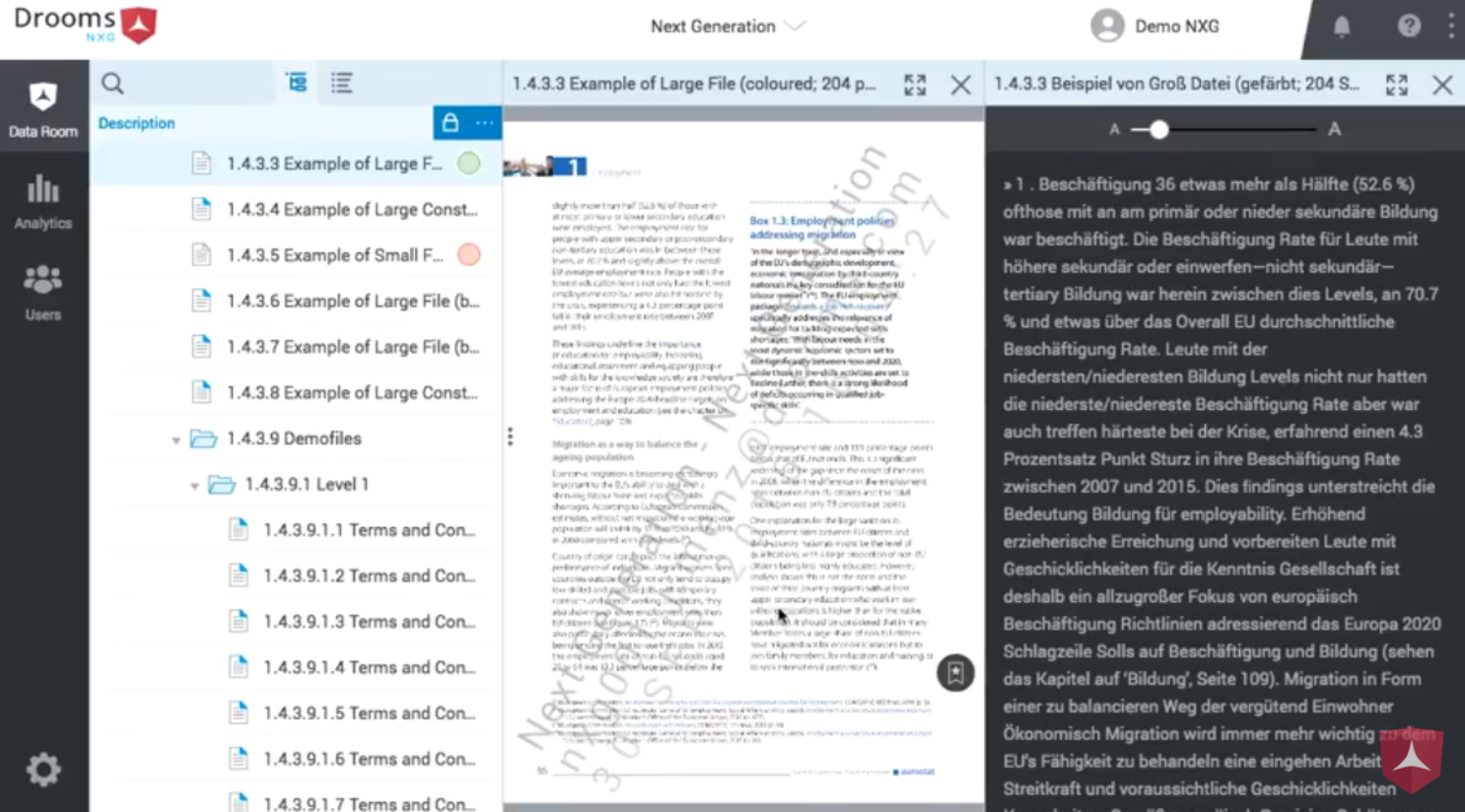 Drooms 데이터 룸 제공 업체는 ISO 27001 인증을 받았으며 GDPR을 준수합니다. 이 플랫폼의 보안 기능에는 256-비트 암호화 및 이중 인증, IP 기반 접근 제한, 최고 수준의 물리적 데이터 저장 시설이 포함됩니다.